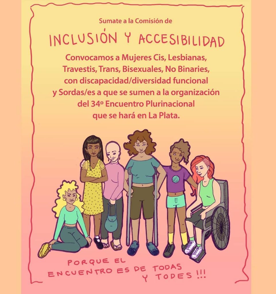 Convocamos a Mujeres Cis, Lesbianas, Travestis, Trans, Bisexuales, No Binaries, con discapacidad/diversidad funcional y Sordas/es a que se sumen a la organización del 34º Encuentro Plurinacional que se hará en La Plata.